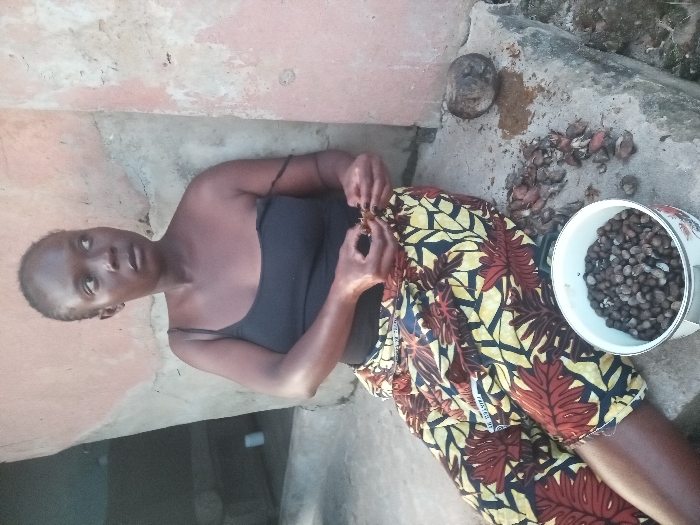 An adult female is seated on a concrete slab, leaning against a weathered, light reddish-brown wall with visible cracks, in Sabon Tasha, Nigeria. She has dark skin and short, dark hair. She is wearing a black spaghetti-strap top, with one strap appearing to have slipped off her shoulder, and a patterned wrapper or skirt featuring yellow, brown, and red foliage designs. Her hands are engaged in peeling small, dark nuts. On the concrete slab in front of her, a white enamel bowl filled with numerous unpeeled or partially peeled dark brown nuts is positioned to her left. To her right, a pile of discarded husks and remnants from the nuts lies on the slab, along with a larger, dark, irregularly shaped object. The concrete surface beneath the discarded material shows dark stains. Behind her, to the left, is an open doorway leading to a dimly lit interior, where a white container is partially visible on what appears to be a surface or floor. The lighting suggests an outdoor setting during daylight hours.