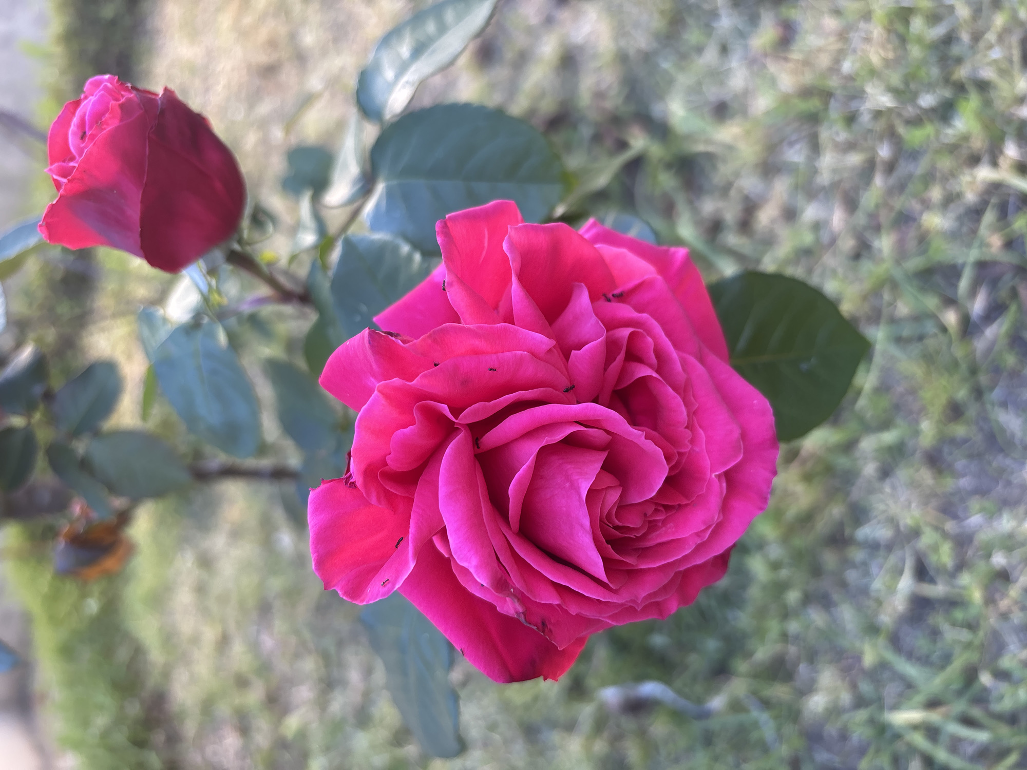A medium shot captures two vibrant pink roses against a blurred backdrop of green grass and foliage, typical of a garden or park setting. The larger rose, fully open, displays numerous petals arranged in a spiral pattern, with several small black ants visible on its surface. A smaller rosebud is positioned to the upper left, partially unfurled. The leaves are dark green and glossy, providing a contrast to the bright pink of the roses. Based on the typical flora and weather conditions, this scene could plausibly be located in a garden or park in Lisbon, Portugal.
