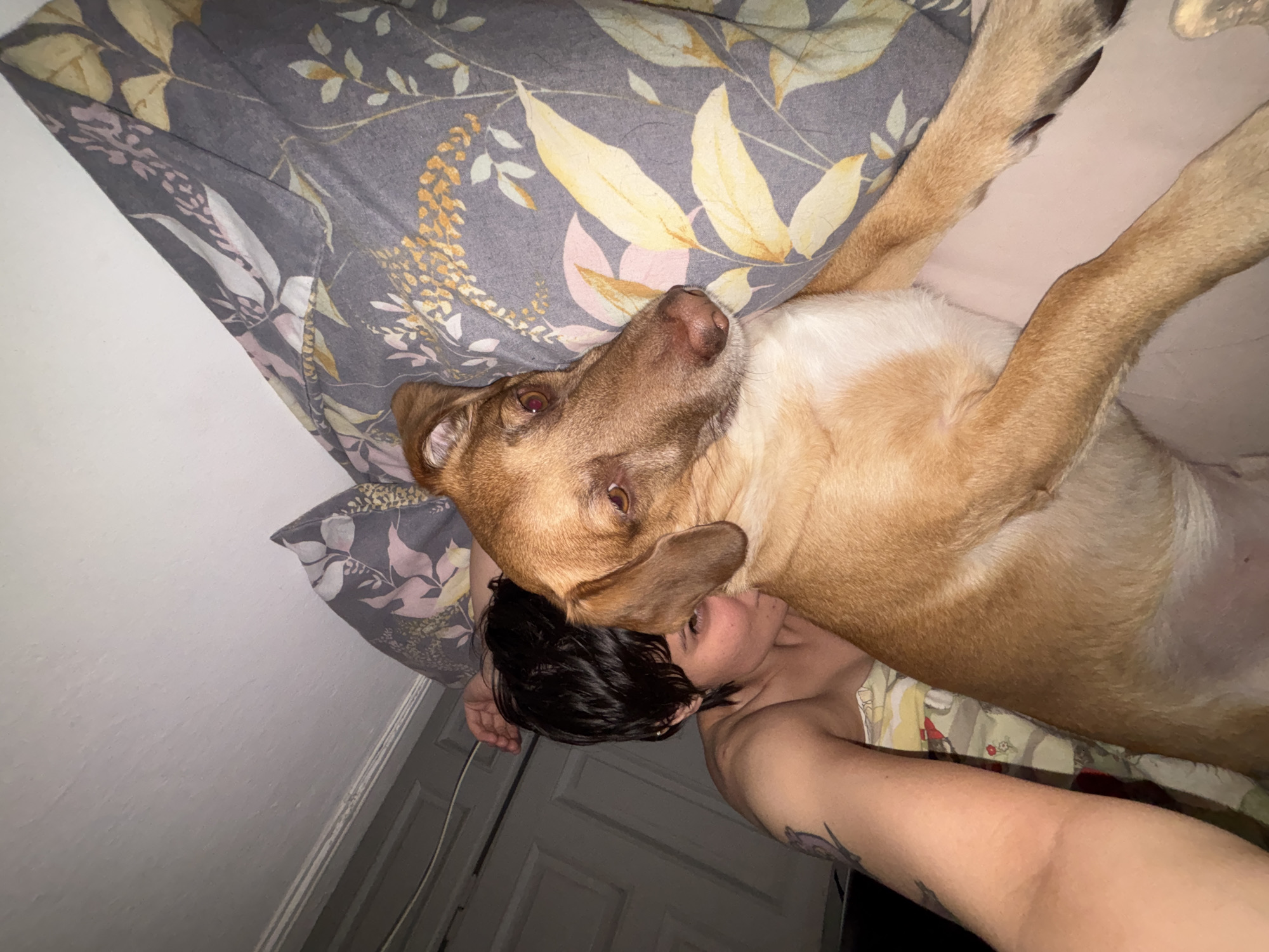 - "A medium-angle, indoor shot shows a person lying on their back in a bed with a tan-colored dog lying on top of them" by FM-NtwGg1, licensed under CC BY 4.0
