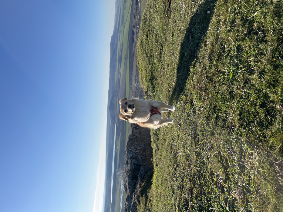 - "A light-colored, medium-sized dog with shaggy fur and pointed ears stands centrally on a grassy hilltop" by FM-m1kZq2, licensed under CC BY 4.0