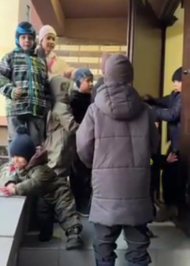A group of approximately seven children, varying in age, are gathered on the steps leading to the doorway of a building. The children are dressed in winter clothing, including hats, coats, and boots. They appear to be trying to enter the building, pushing and crowding around the doorway. A light fixture is visible on the ceiling above the entrance. The building’s exterior is constructed of brick and concrete. The children are talking to each other.