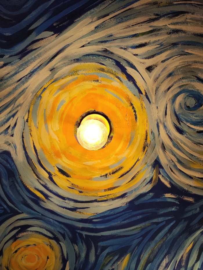 A single, lit, white-yellow incandescent-style light bulb is centrally recessed into a painted surface. The surface displays a hand-painted mural executed in a post-impressionistic style, reminiscent of Vincent van Gogh's "The Starry Night." The light bulb is surrounded by concentric, swirling brushstrokes of vibrant yellow and orange paint, creating a halo effect. Beyond this immediate yellow field, the mural features broad, undulating strokes in various shades of dark blue, medium blue, light blue, and white, forming dynamic, cloud-like or celestial patterns. A smaller, distinct yellow and blue swirl is visible in the lower-left corner of the image. The paint application appears thick and textured. No people or direct actions are depicted. This interior decorative element is located within the city of Cuzco, Peru.
