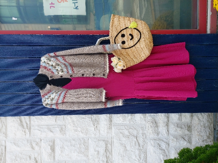 The image depicts an outdoor clothing and accessory display, presumed to be in 강화군, South Korea. A black high-neck top is layered under a fuchsia-colored sleeveless dress. Over these, a beige knitted cardigan with a Fair Isle-style pattern in light blue, red, and off-white is buttoned down the front. The cardigan features fuzzy white trim on its cuffs and hem. To the right, a light brown woven straw tote bag is suspended, adorned with a black embroidered smiley face and a small yellow pom-pom. This bag contains several cream-colored artificial flowers. The display is set against a dark blue vertical corrugated panel. To the left of the panel, a white textured stone wall is visible. To the right of the panel, a window with a red frame is present, reflecting a sign with Korean characters and displaying yellow elements at its base. A small portion of a green shrub is visible in the bottom left corner.