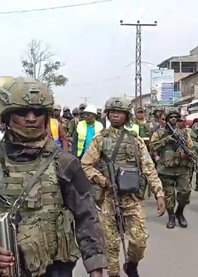 A group of armed soldiers in camouflage uniforms, helmets, and vests, are marching down a street in what appears to be an urban area. Some civilians, including men in suits and high-visibility vests, walk alongside or near the soldiers. The street is lined with buildings and shops. The overall atmosphere seems tense, with a sense of authority and security presence.