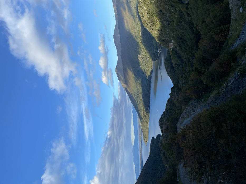 The image presents a panoramic view of a mountainous, lacustrine landscape, consistent with the Patagonian region of Argentina. A large, calm body of water, likely a lake, occupies the central and mid-ground, extending into the distance where it narrows between landmasses. Its surface reflects the overhead blue sky, which features scattered white and grey cumulus clouds. Steep, heavily forested mountains flank both sides of the water body. The vegetation on these slopes is dense, consisting primarily of green trees, with some deciduous trees in the foreground exhibiting reddish-brown foliage. Direct sunlight illuminates sections of the mountains and the water, creating distinct lines of shadow on the terrain, particularly on the right-hand slope. In the far distance, lighter-colored mountain ranges are visible beneath a hazy sky. A small, white building with a red roof is discernible on the far left shore of the lake, at the base of the mountains. The immediate foreground features a dark, steep, rocky slope covered with sparse vegetation and loose scree, descending towards the lake. No individuals, animals, or vehicles are present in the scene.