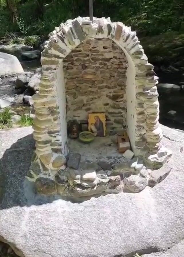 small, stone, religious shrine erected on a large rock by a flowing river. The shrine, built in an arch shape, houses a religious icon, a small bowl, and other small, unidentifiable objects. A cross is positioned on top of the shrine. The river flows past the shrine, with rocks scattered throughout the water. Green foliage is visible along the riverbank and in the background, suggesting a wooded area. The overall lighting indicates a sunny day.