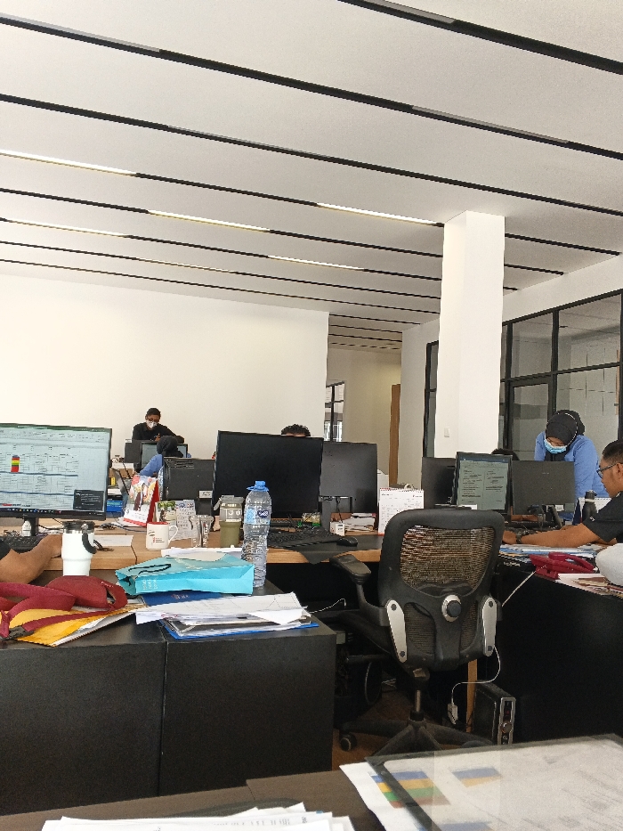 An office setting shows multiple people working at desks with computers. Some are wearing masks. The room is bright, lit by long, linear ceiling lights. There's a white support pillar in the middle ground. A water bottle sits on a desk amid office clutter. An empty chair occupies the foreground. Documents and papers are also visible in the foreground.