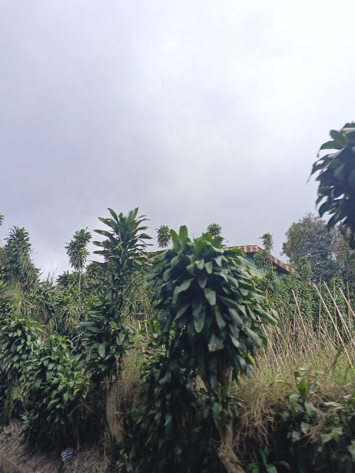 The image depicts a rural or semi-rural scene in Siexiengmai, Laos, under an overcast sky. The upper two-thirds of the frame are occupied by a uniform light grey sky. The lower third features dense tropical vegetation, primarily comprising tall, green plants with robust, elongated leaves, many exhibiting a spiral or layered arrangement along thick stems. Dried, brown vegetation is visible at ground level and interwoven with the green foliage. In the midground on the right, a cluster of thin, vertical wooden or bamboo poles is present. Partially obscured by trees in the upper midground, a structure with a light green or teal-colored corrugated metal roof is visible. The immediate foreground shows dark earth or mud, with a small piece of white debris on the left. No people or discernible actions are present.