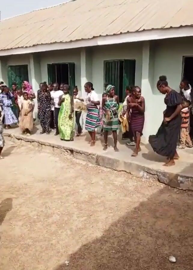 A group of at least a dozen people, mostly children, are gathered in an outdoor area, with a single-story building as a backdrop. Several people are standing along the raised concrete foundation of the building, some of whom are dancing. Four women are at the forefront of the dancing. One woman is wearing a long black dress and the others are wearing short traditional garments. The children appear to be dancing to the music. The ground in front of them is a mix of dirt and gravel. The building is a pale green color with white trim around the windows and roof. The sky is overcast.