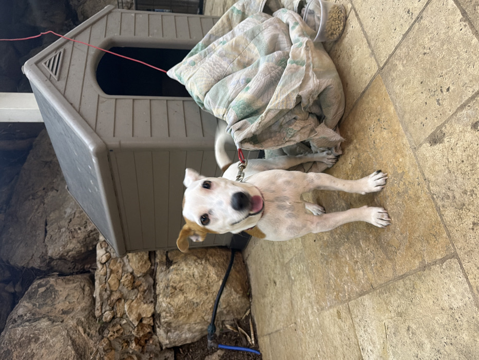 - "A Jack Russell mix dog is lying on a tiled patio next to a plastic dog house covered with a beige and green quilt" by FM-grnl23, licensed under CC BY 4.0