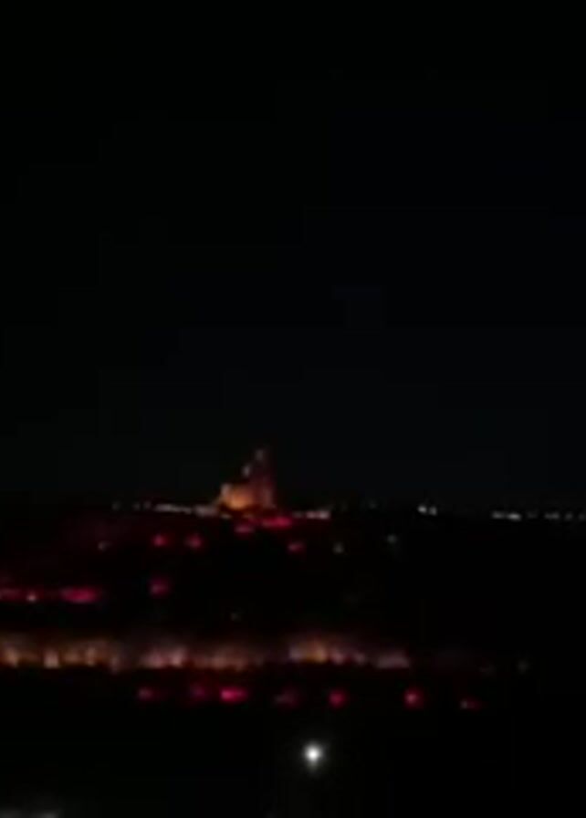 nighttime view of a hill with a structure on top. The hill is illuminated with red lights, and the structure appears to be a monument or statue. There are other lights in the distance that may be from a city.