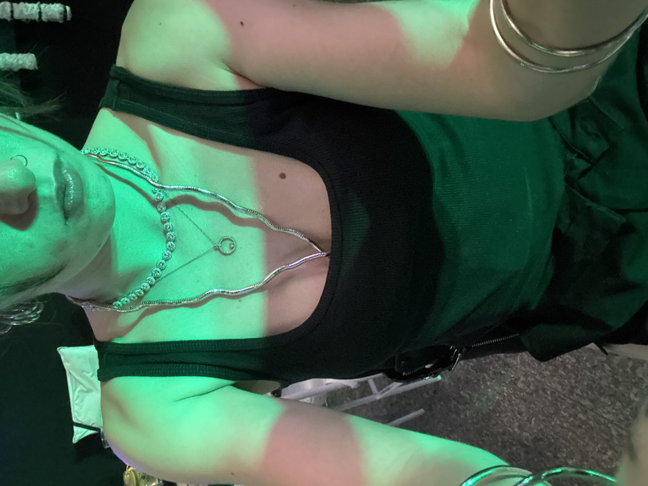 A person is captured from above, wearing a black tank top and a jacket. Several necklaces adorn their neck, one with a circular pendant. Multiple bracelets are visible on their arm. The scene is illuminated by green light, casting an unusual hue over the subject and surroundings. Details such as the person's face and the texture of their clothing are visible, along with part of an outdoor pavement.