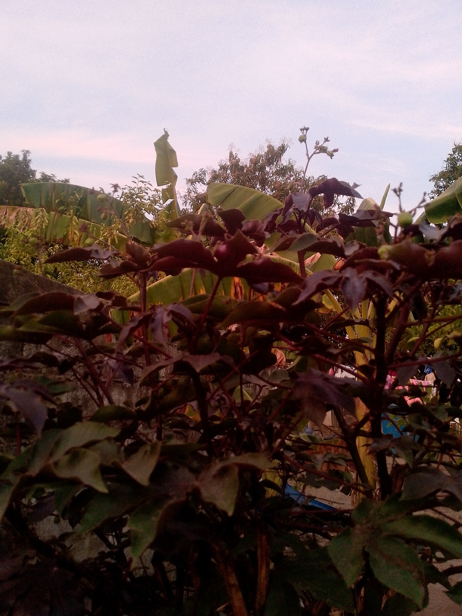 The image depicts a dense thicket of plants, primarily featuring dark green and reddish-brown foliage in the foreground. Banana trees are visible behind the plants, and other leafy trees are in the background against a pale sky, possibly at dusk or dawn. The location is inferred to be Juan Griego, Venezuela, given the prompt's specification. There are no people visible in the frame. The environment suggests a natural or garden setting. The presence of a wall or structure is suggested by the dark area at the lower left.
