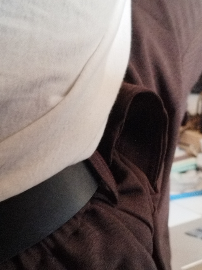 The image depicts a close-up, angled view of layered textiles, consistent with clothing worn by an individual, situated in Muka, Indonesia. The left portion of the frame is dominated by an off-white or light gray fabric, displaying soft folds. A horizontal band, dark gray to black in color, spans the lower-mid section, positioned between the light fabric and a dark brown or maroon fabric. The dark brown fabric occupies the right side of the frame, exhibiting pronounced folds and creases, with a deep, shadowed fold forming an interior recess on the upper-right. All visible fabrics present a soft, pliable texture. The background is out of focus, indicating an indoor setting with indistinct light-colored objects visible on a surface to the far right. No human features, specific actions, or interactions are discernible within the frame.