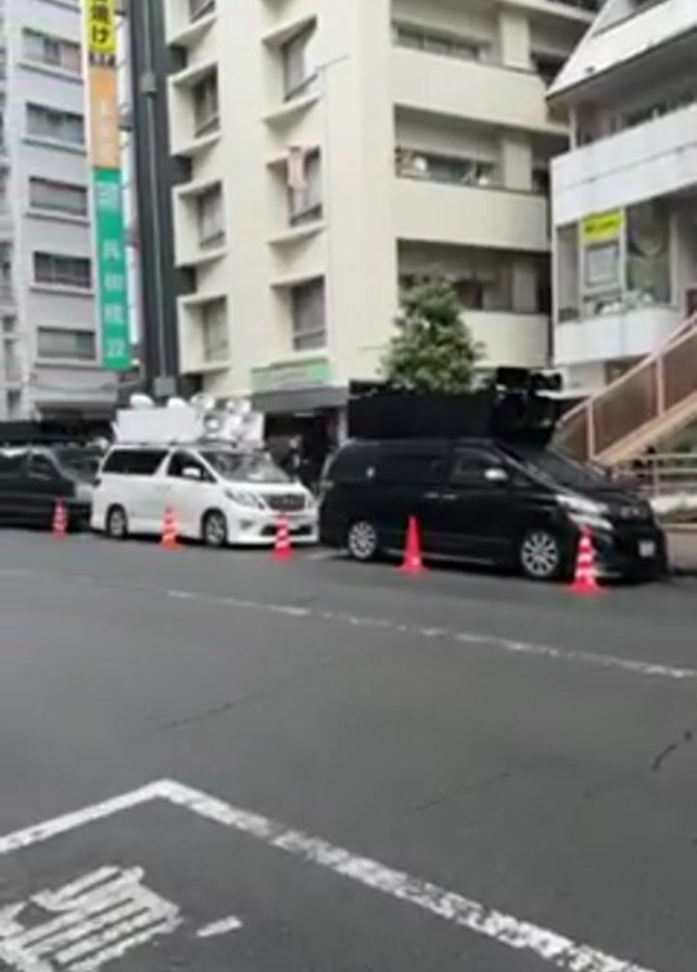 street scene in Japan. Several vehicles are parked along the side of the road, including white and black vans, as well as a silver Alfa Romeo. Orange traffic cones are placed around the vans. Several apartment buildings are visible in the background. There is a blue truck and a person walking behind it. Street signs and trees are also visible.