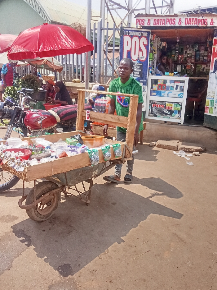 The image depicts a vibrant street market scene in Akwanga, Nigeria, under bright daylight. In the immediate foreground, a young man, appearing to be in his late teens or early twenties, stands facing slightly left, holding a rudimentary wooden frame attached to a metal wheelbarrow. He wears a short-sleeved green t-shirt with a graphic on the front, light-colored trousers, and dark slide sandals. The wheelbarrow serves as a mobile display unit, laden with various small retail items including combs, white plastic containers, clear plastic bags containing small metallic objects (possibly nails or screws), and several bottled liquids displayed on the wooden frame. To the man's right, a compact market stall with a corrugated roof is visible, displaying signage that reads "POS & DATA POS & DATAPOS &" across the top and "FG COMMUNICATIONS POS" vertically on a banner. The stall's interior showcases various mobile phones, accessories, and possibly SIM cards arranged in clear display cases. A person is partially visible within this stall, seated behind a counter. To the man's left, partially obscured by him and the wheelbarrow, is a red motorcycle parked near another market setup. A large, open red umbrella provides shade over a vendor area where at least two individuals are present, one seated behind what appears to be a counter or display of goods, possibly produce given the green leafy items. The ground surface is a mix of light-brown dirt and paved sections, showing significant shadows cast by the man and the wheelbarrow, indicating the sun is positioned to the right and slightly behind the viewer. In the background, metal scaffolding or structural elements are visible, suggesting further construction or market infrastructure. No direct interactions between the visible individuals are explicitly depicted; rather, they are positioned within their respective commercial activities.