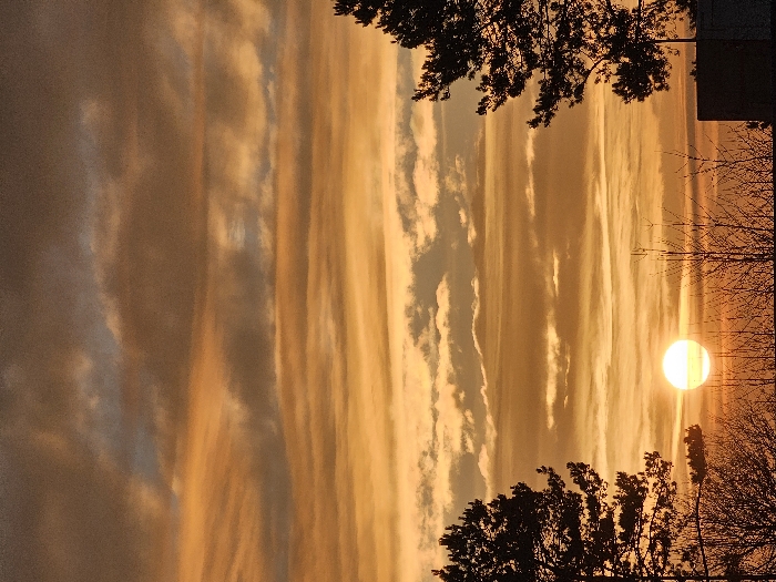 A vibrant golden sunset dominates the scene, streaked with vertical bands of orange and white clouds. Silhouetted tree branches frame the top and bottom, adding depth. The sun, a radiant orb, is partially obscured by the trees. A dark, rectangular structure hints at a building in the background, slightly cropped on the right. The image is vertically oriented, emphasizing the height of the clouds and trees.
