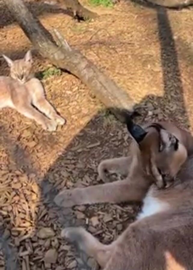 Two Caracals are resting on a bed of wood chips beneath a tree. One Caracal lies in the background, its eyes closed. The other Caracal is larger and lies in the foreground with its eyes closed. The larger Caracal then opens its eyes. The scene is shot from above. The wood chips are brown. A tree branch and sunlight shadows are visible in the scene.