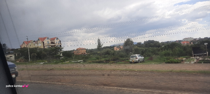A roadside view captures a landscape dotted with buildings. On the left, a row of beige houses with red roofs stand prominently. Further into the frame, smaller structures with similar hues are scattered amidst green vegetation. An SUV-style car is parked near the road, adding a touch of modern presence. The scene is set under a cloudy sky, contributing to a slightly overcast atmosphere. Overhead, power lines extend across the vista.