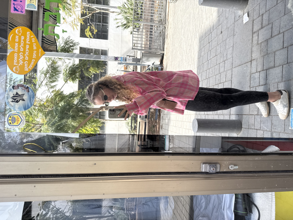A female subject is depicted in a full-body reflection on a glass storefront or door in Tel-Aviv, Israel. The subject, with light-colored curly hair, wears dark oval sunglasses, an oversized pink and white plaid long-sleeved shirt, black leggings, and white sneakers with dark accents. A small brown leather cross-body bag is visible on her right hip. She holds a dark-colored smartphone with multiple rear cameras in her right hand, angled towards herself, indicating the act of taking a self-portrait. The immediate environment consists of a light grey paved sidewalk with several grey cylindrical bollards. The glass surface bears multiple stickers, including a circular emblem, a circular graphic of a figure in water, and a yellow heart-shaped sticker with Hebrew text that reads, "If you believe you can ruin, believe you can fix." Further reflections reveal green trees, a white building with dark-framed windows, and metal railings in the background, characteristic of an urban setting. The glass door frame is made of light brown/gold aluminum and features a visible lock mechanism.