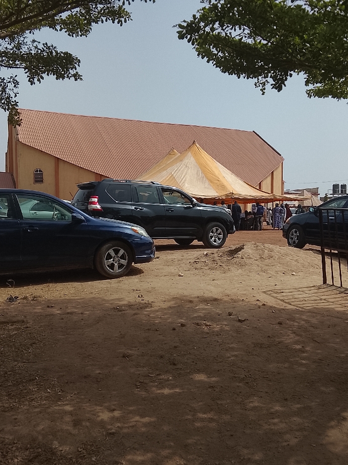This image depicts an outdoor scene in Mangu Town, Nigeria, characterized by a mix of vehicles, structures, and individuals under a clear sky. In the foreground, the ground is unpaved, reddish-brown earth with visible tire tracks and minor undulations. Shadows from overhead trees, whose green foliage frames the top of the image, are cast across the ground. Several vehicles are parked on this unpaved surface. A dark blue sedan, possibly a Toyota Matrix, is positioned on the left, oriented slightly towards the right. Immediately behind it and further to the right, a dark-colored SUV, identifiable as a Toyota Land Cruiser Prado, is parked, facing left. On the far right, partially obscured by a dark, vertical barrier or fence, is a section of another dark-colored vehicle, likely a sedan or small SUV. In the mid-ground, a large, multi-peaked tent structure with light orange or beige fabric is erected. Under and around this tent, several individuals are visible, standing and congregating. Their specific attire and actions are indistinct due to distance. The background is dominated by a substantial building, possibly a church, featuring a distinct, pitched roof clad in orange-red corrugated material. Its walls are a light, possibly cream or beige, color, and an arched window is visible on the left side of its visible facade. Further in the background, to the right, other indistinct structures and water tanks on rooftops are faintly visible under the clear, pale blue sky.