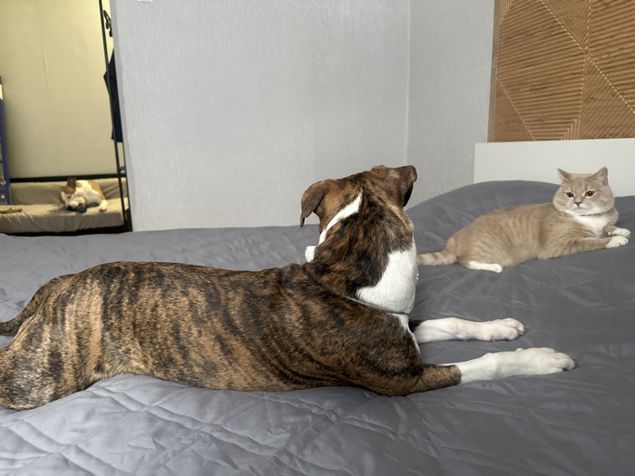 The image depicts an indoor scene within a residence in Nekrasovskiy, Russia, likely a bedroom. A brindle and white dog, possibly a Pitbull type, is lying prone on a gray quilted bedspread in the foreground, facing towards the right. Its head is slightly turned towards a light brown/cream colored cat positioned on the bed to the right, which is lying with its front paws extended, facing left towards the dog. This cat wears a light-colored collar. In the background to the left, a large mirror reflects a partial view of a room element resembling a bunk bed or elevated sofa, upon which a third animal, a white and brown/orange patched cat, is resting. The background on the right features a light-colored wall with a decorative wooden headboard exhibiting a geometric pattern. The animals are stationary, with the dog and the first cat appearing to observe each other.