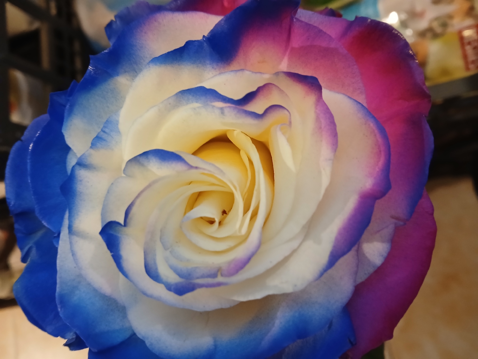 A close-up shot focuses on a rose with variegated coloration. The petals display a blend of blue, white, and pink hues, with the center exhibiting a yellowish tint. The rose appears to be in full bloom, revealing its intricate petal structure. The shot doesn't provide any information on whether it is in the city of Vratsa, Bulgaria.
