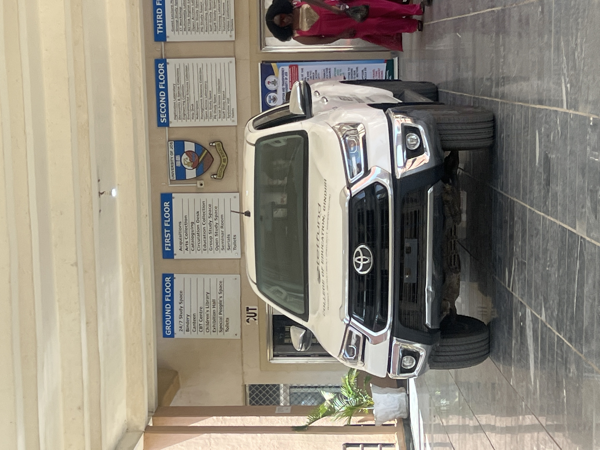 A white Toyota Hilux pickup truck is centrally parked on a dark tiled floor inside a multi-story building at the University of Jos, Nigeria