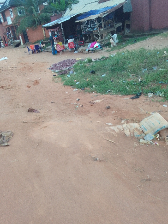 The image depicts an outdoor scene in the city of Unknown, Unknown, characterized by an unpaved reddish-brown dirt road that dominates the foreground and extends into the midground. To the right of the road, a strip of sparse green grass is visible, heavily littered with various debris including plastic bags, wrappers, and other refuse. In the midground, towards the left, a large pile of reddish-brown, irregularly shaped objects, possibly root vegetables or tubers, rests on a dark ground cover or tarp. Adjacent to this, several plastic chairs are arranged on the dirt: three blue, two red, and one yellow. Behind the chairs and the pile of objects stands a makeshift market stall or shop structure. This structure features a weathered corrugated metal roof, partially covered by a blue tarp, supported by wooden posts. Goods, including a bundle of colorful fabrics (pink, white, blue), are visible around and within the stall. At least three individuals are present near the stall. One person, wearing a dark shirt and trousers, stands facing the stall. Another person, in a light-colored top, is seated behind a surface within the stall. A third, partially obscured individual is also visible inside the structure. In the background, on the far left, a multi-story building with a light-colored facade and reddish-brown sections is visible. Green foliage, possibly palm leaves, is present near this building. A solid reddish-brown wall forms the background on the far right, behind the market stall. The lighting suggests daylight conditions, possibly late afternoon, casting an even glow across the scene. A discarded, partially opened bag labeled "CEMENT" lies on the dirt road in the far right foreground. A woven sack or fabric bundle is present on the far left foreground.