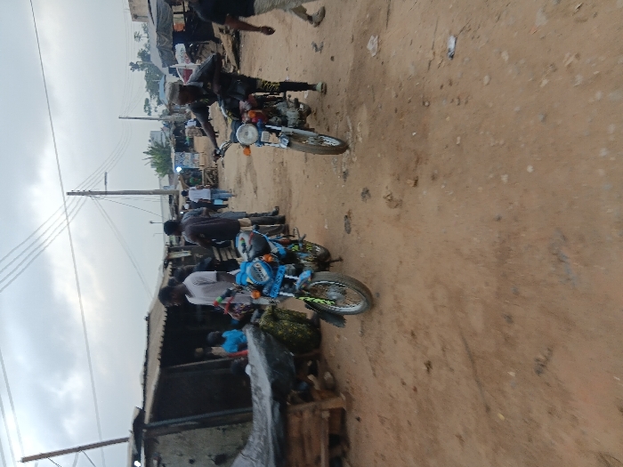 Two motorcycles are parked on a dirt road amidst a bustling outdoor scene. A group of people is gathered around them. The scene is framed by basic structures with corrugated roofing on the left, and utility poles and wires are visible in the background. The sky is overcast. The image suggests a local market or gathering point in a rural or developing area.