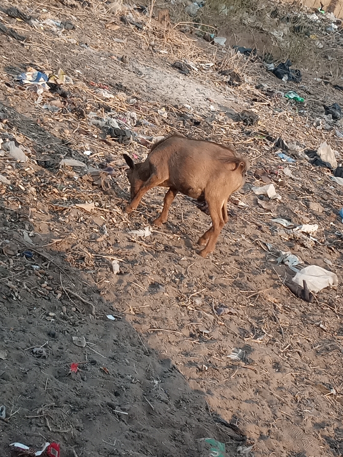 A brown goat stands amidst a cluttered landscape, littered with trash and debris. The goat's head is lowered, as though grazing or foraging. The ground is uneven, marked with shadows and scattered refuse. The scene conveys a sense of environmental degradation and the goat's struggle for sustenance in a polluted area. The lighting suggests either dawn or dusk.