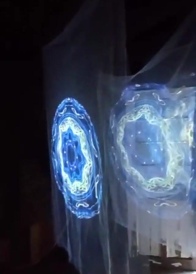 two screens displaying psychedelic animations, one on the right, and one on the left that is obscured by what appears to be a hanging white net or cloth