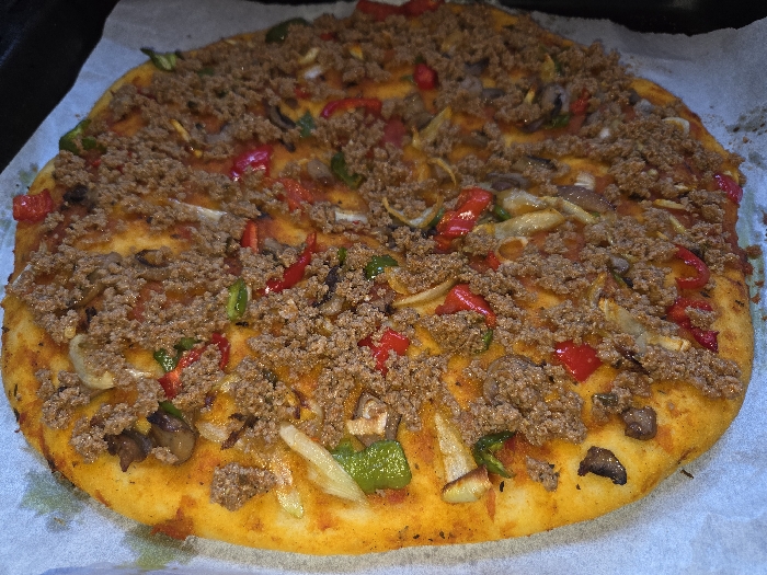 - "A circular, baked flatbread-style dish, consistent with a pizza or lahmacun, is depicted from an overhead perspective" by FM-yER7B2, licensed under CC BY 4.0