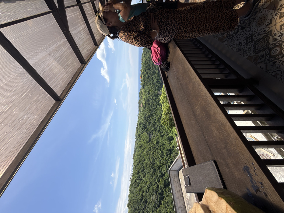 An elevated outdoor viewing platform in Pejukutan, Indonesia, is depicted under a bright blue sky with sparse white clouds. A translucent corrugated roof structure provides overhead cover. A dark wooden counter-railing spans the mid-ground. On the counter's left, a partially consumed coconut with visible white flesh and a black rectangular wallet are present. Further to the right on the counter, a bright pink drawstring bag is situated. A woman stands in profile on the right, wearing a long leopard-print dress, a light-colored baseball cap with sunglasses perched on top, and a bracelet on her left wrist. She is looking towards the distant landscape. A second individual is partially visible behind her to the right, wearing a teal-colored shirt. The background reveals a vast, densely vegetated valley or steep hillside, descending to meet the ocean visible on the distant horizon.