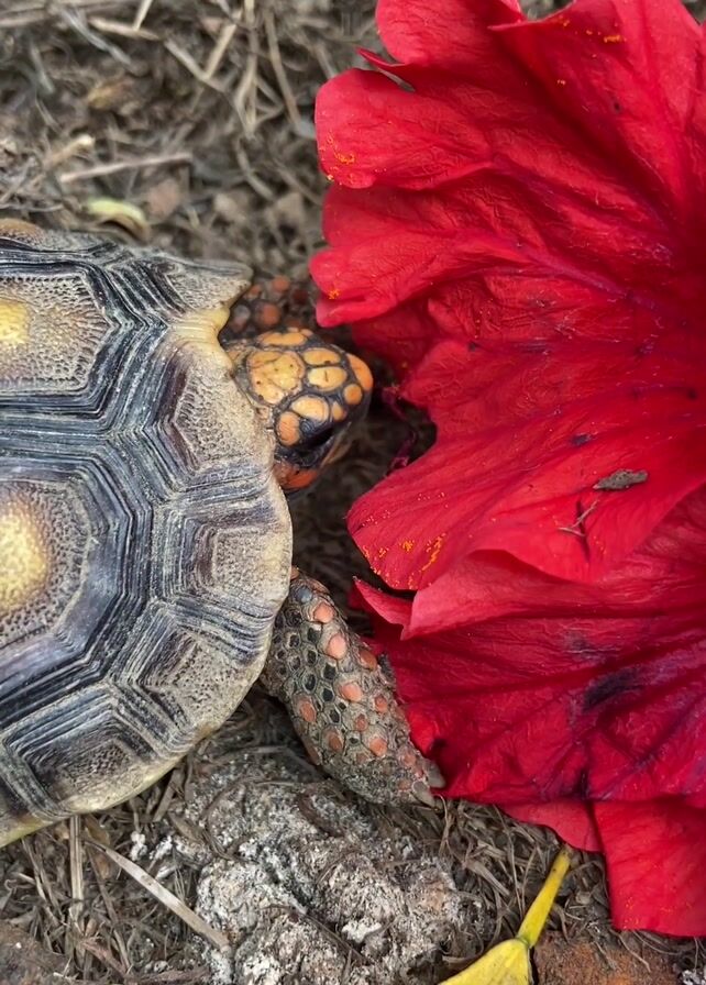 small tortoise on dry ground covered in leaves and twigs, next to a bright red hibiscus flower