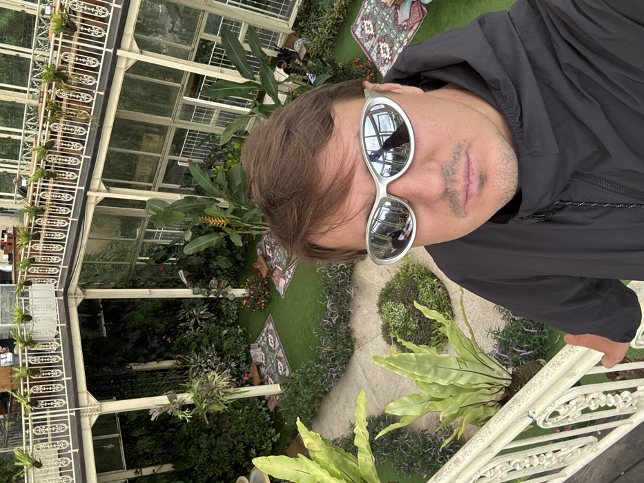 - "A person wearing silver, oversized sunglasses and a dark-colored jacket stands outdoors, with a lush garden and greenhouse visible in the background" by FM-7OTCf2, licensed under CC BY 4.0