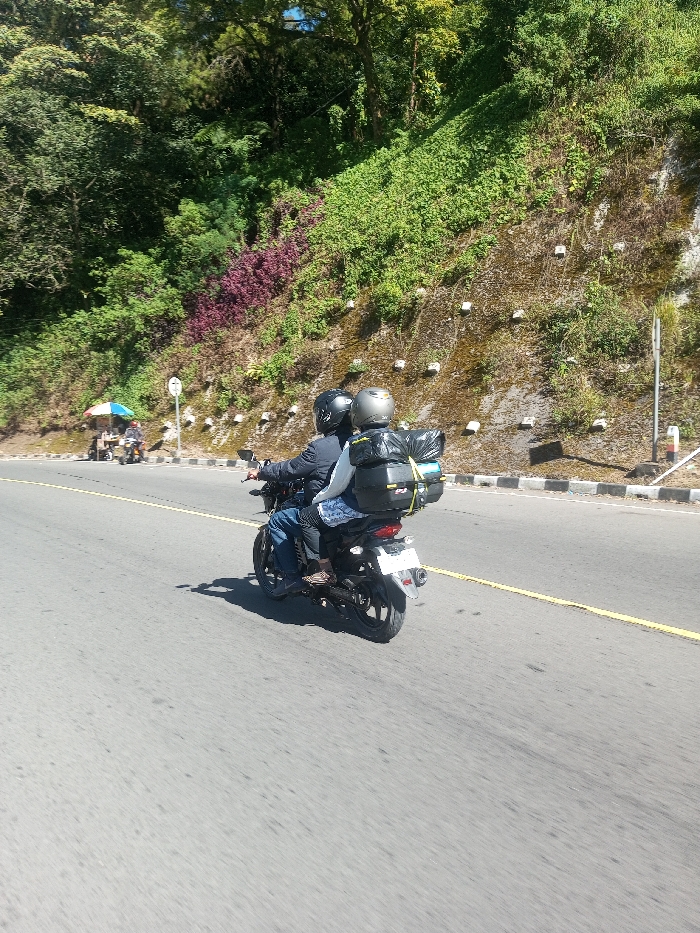 The image displays a daytime scene on a paved road in Ka Thaung (Upper), Myanmar. A dark motorcycle is observed from the rear-left, in motion along the grey asphalt road, which features a faint yellow line on its right edge. Two individuals occupy the motorcycle. The driver wears a black full-face helmet, a dark jacket, and blue jeans. The passenger, seated behind, wears a light grey open-face helmet, a light-colored long-sleeved top, and patterned bottoms. The motorcycle's rear is equipped with a black hard-shell top case, above which a large black bag and a smaller blue bag are secured with yellow straps. To the right of the road, a steep hillside rises, covered with dense green foliage, patches of reddish-purple plants, and multiple white rectangular erosion control anchors embedded into its surface. Large trees are visible along the upper portion of the hill. In the distant left background, a roadside vendor stall with a colorful umbrella and several indistinct figures near a motorcycle are visible. Direct sunlight casts visible shadows.