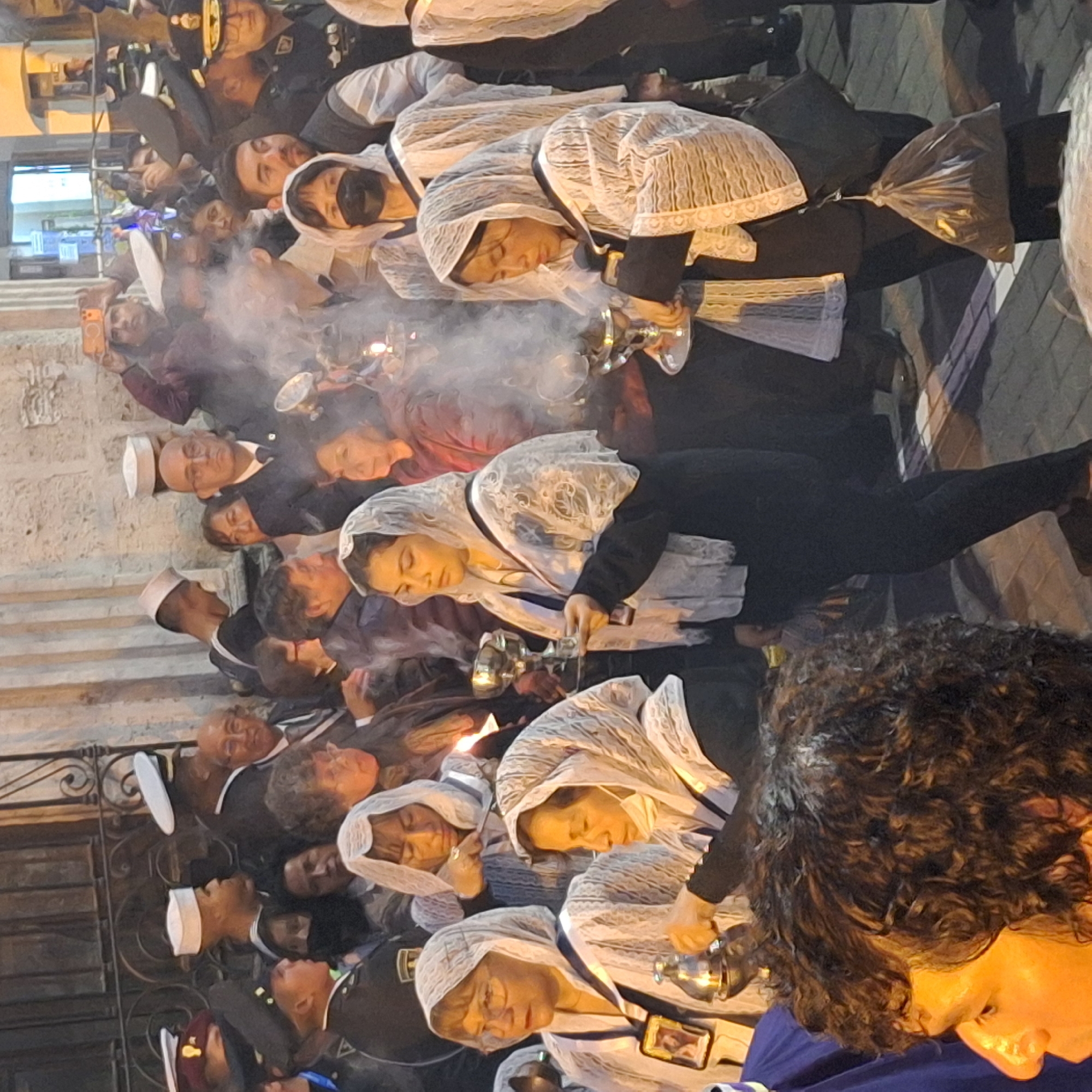 procession in Arequipa, Peru. A large group of people are gathered, some wearing traditional attire, including black suits and white lace veils. Many are holding and swinging smoking incense burners. There are uniformed individuals with white hats present in the procession. The environment appears to be a city street at night, with buildings and street lighting visible. Smoke from the incense burners adds to the atmospheric effect.