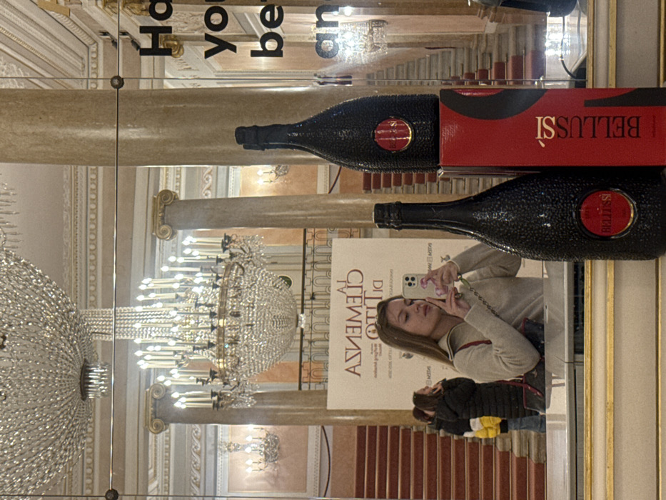 The image depicts a mirror selfie taken inside the grand foyer or galleria of Teatro La Fenice in Venice, Italy. In the immediate foreground, a young woman with long, light brown hair, wearing a beige quarter-zip sweater and a dark-colored shoulder bag, holds a white iPhone with a pink-patterned case to capture her reflection in a large, clear mirror. To her right, two dark-colored sparkling wine bottles, labeled "BELLUSSI" with red and gold accents, are displayed on a light-colored counter. One bottle stands upright on a red rectangular box also labeled "BELLUSSI"; the other lies horizontally, partially obscured, next to it. The background, visible as a reflection, showcases the ornate interior of the theater. Two large, multi-tiered crystal chandeliers hang prominently from the ceiling, illuminated. Fluted marble columns with gold Corinthian capitals frame the space. A grand staircase with red carpeted steps and a white balustrade is visible on both the left and right sides. Centrally positioned in the reflection is a large white poster displaying the opera title "LA CLEMENZA DI TITO" (rendered in reverse due to the mirror). Several wall sconces with multiple candle-like lights are affixed to the walls. Two additional individuals are partially visible in the reflected background on the left, near the staircase. Fragments of a gold-lettered sign, reading "Ha," "yo," "be," and "an," are visible in the upper right quadrant of the reflection.