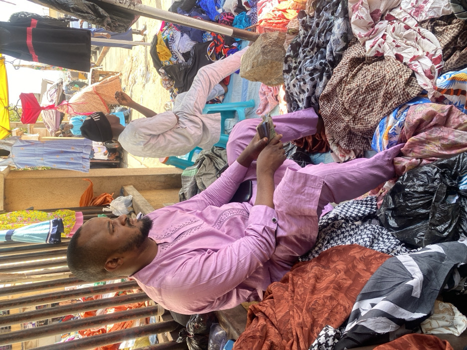 This image depicts an outdoor market scene in Sabon Gari South, Nigeria. In the foreground to the left, an adult male with a beard is seated, facing right in profile. He wears a lilac-colored traditional tunic with intricate embroidery on the chest and sleeves, along with matching trousers. He holds a stack of paper currency in both hands, appearing to count or organize it. A black smartphone is partially visible near his left hip. He is surrounded by large piles of folded and crumpled textiles, including patterns such as houndstooth, abstract geometric, and floral designs, along with a black plastic bag on the ground. In the mid-ground to the right, a younger male is seated on a small, light blue plastic stool. He wears a light-colored tunic and trousers and a black knit beanie with white lettering. His right hand is raised, holding a small, indistinct object. He is also situated amidst piles of various clothes on the ground. The background reveals further market activity, with clothes hanging from overhead wires, including dresses and undergarments. A yellow canopy or tarp provides shade overhead. Metal bars are visible behind the primary subject. The ground surface appears unpaved. A large, light-colored stone is present on the ground between the two individuals. Distant figures and market stalls indicate a busy commercial environment under daylight conditions.