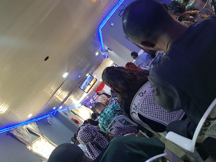 The image depicts an indoor gathering in Jos, Nigeria, viewed from a slightly elevated and tilted angle, looking across a room filled with seated individuals
