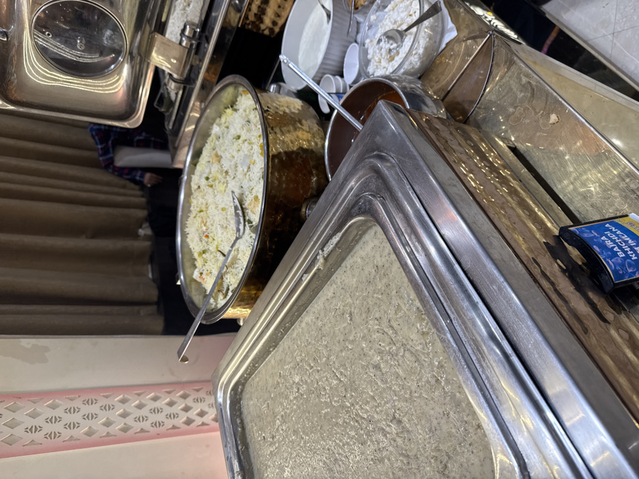 A top-down view reveals a buffet setup with several silver containers filled with food. Fried rice is visible in a hammered gold-toned bowl. A silver container holds a creamy, light-colored dish. Other containers hold sauces and what appears to be a yogurt-based dish. A blue sign with white lettering, possibly indicating the dish name, is partially visible on the right-hand side.