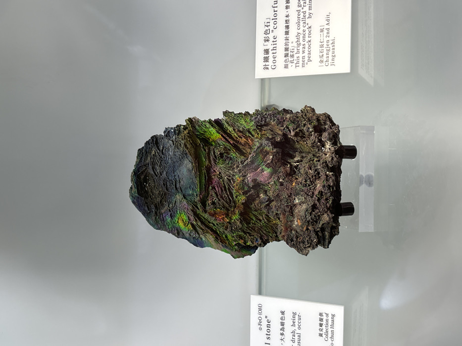 display of goethite, a "colorful stone," identified by its chemical formula, α-FeO(OH). The rock's vibrant colors led to its past nickname, "peacock rock." The exhibit information credits the specimen to the collection of Co-chun Huang. It was found in Jinguashi, Changjen 2nd Adit. The Chinese text notes that brightly colored goethite specimens were once called "rainbow peacock stones" by miners.