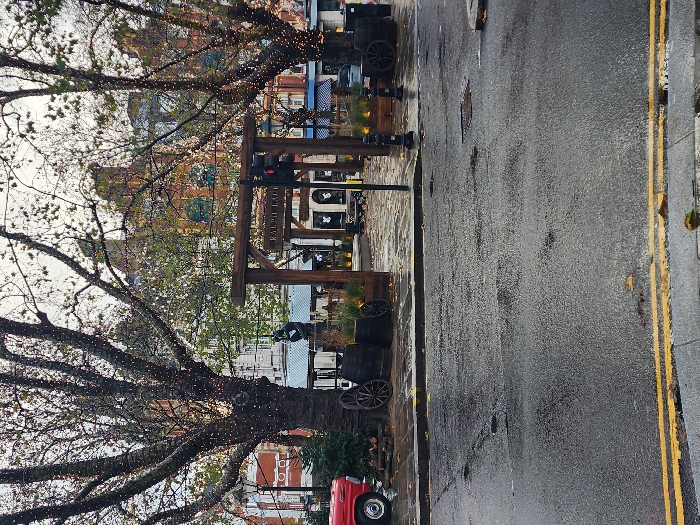 The image depicts a street scene at Burlington Gardens, near New Bond Street, in the city of London, United Kingdom. The ground in the foreground is wet asphalt, showing reflections and scattered fallen leaves, indicative of recent rain. Double yellow lines mark the curb on the left side of the road. To the left, the front quarter of a red vehicle, possibly a classic car or truck, is parked at the curb, with a visible chrome bumper and a white-walled tire. Adjacent to it, a dark green shrubbery is present. In the midground, two large, bare deciduous trees, adorned with numerous small white decorative lights, frame a central pedestrian area. Beneath the left tree, a dark statue, resembling a human figure, stands on a dark pedestal, surrounded by several large wooden wagon wheels and dark barrels. A rustic wooden archway, featuring the sign "RALPH LAUREN" prominently across its top beam, serves as an entrance to a paved area. Beyond the archway, the facade of a building with retail display windows is visible. A black traffic light pole, displaying a red light, stands centrally in front of the archway. To the right, additional wooden wagon wheels and dark planters are arranged near the base of the second illuminated tree. Black bollards are visible on the paved area. The background features multi-story historic buildings with brick facades. A prominent building behind the trees is reddish-brown brick with multiple arched windows, some tinted green. The sky is overcast and light grey. No people or moving vehicles are visible in the scene.