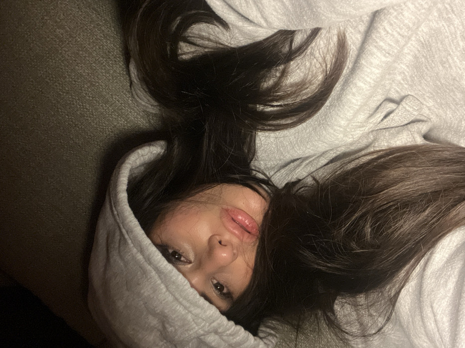 An image depicts a young adult female lying on her side, facing the viewer