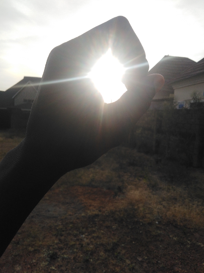 A daytime outdoor photograph, taken in the city of Jos, Nigeria, features a silhouetted human hand positioned to frame the sun