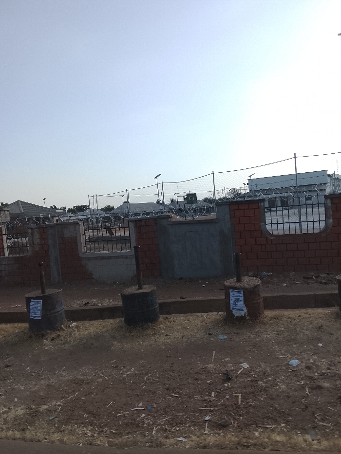 The image depicts an outdoor urban environment in Wukari, Nigeria, under a clear, bright daytime sky. The foreground shows unpaved, dry reddish-brown dirt ground with sparse dead grass and scattered debris, including paper and small plastic items. A low concrete curb runs horizontally across the scene. Situated on the dirt, behind the curb, are three dark, cylindrical objects, likely repurposed drums filled with concrete, each with a central vertical metal pole. White paper notices are affixed to the drum on the far left and the one in the middle. In the midground, a perimeter wall is visible, constructed with sections of red brick and unplastered grey concrete. Multiple black metal grate sections are integrated into this wall. Above the wall and an accompanying wire mesh fence, coiled razor wire or barbed wire is installed. The background reveals several buildings with dark-colored roofs. Numerous streetlights equipped with solar panels are positioned behind the fence line. A basketball hoop with a backboard is discernible behind the perimeter. Further back, a larger, light-colored building with multiple windows is present. No individuals are visible within the frame.