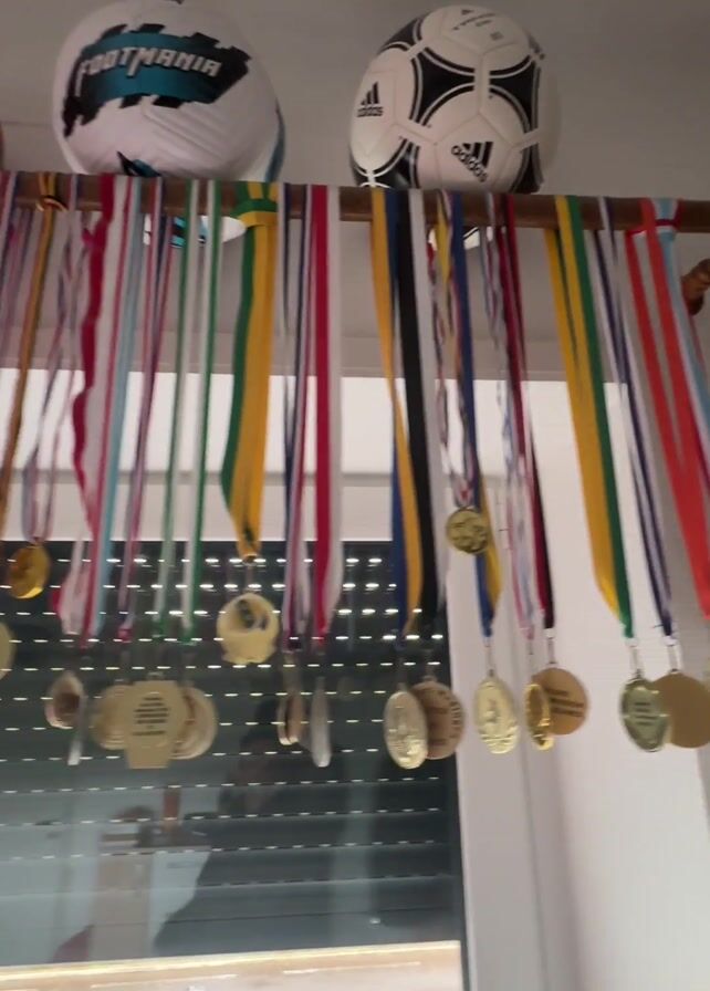 collection of soccer balls resting on a wooden rod hung near a window, with many medals suspended from the rod by ribbons. The window has closed blinds and is positioned in a room with white walls. The soccer balls are of varying designs and colors. The medals are mostly gold and silver in color, and the ribbons are of various colors, including red, white, green, yellow, and blue. A car can be seen through the window. The camera pans from right to left, showing the entire length of the rod and the displayed items.