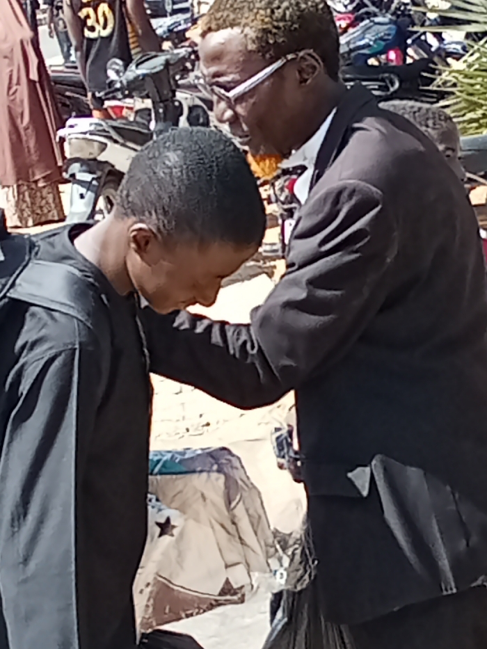 This image depicts an outdoor scene in Shaba, Nigeria, featuring two primary individuals in the foreground