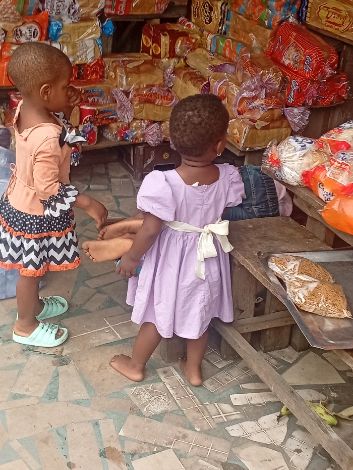 The scene is an open-front market stall or shop in Umuode, Nigeria